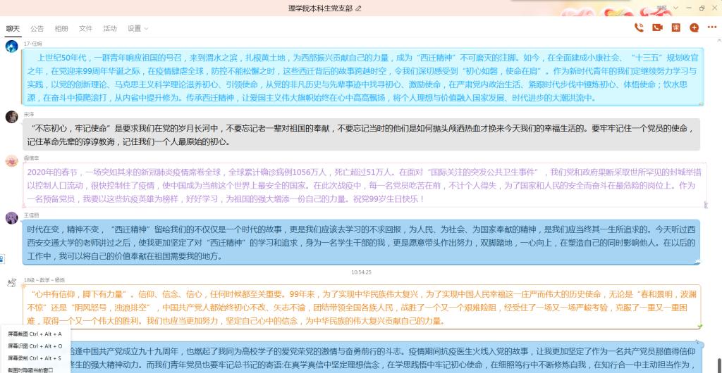杜芳:2020年7月1日,是中国共产党99周岁生日,党支部组织大家一起学习了党旗飘扬,筑牢红色防火墙的“七一”特别节目。中国人民大学、复旦大学、西安交通大学和北京科技大学的师生给我们分享了高校在党建中贡献的力量。中国人民大学深度剖析了中国共产党人民至上的永恒价值追求,与云南兰坪县建立帮扶关系,促进当地教育和经济发展,响应我党全面小康一个都不能少的号召。复旦大学践行《共产党宣言》理念,发扬望道精神,不忘跟党初心,传承红色基因希望。西安交通大学传承西迁精神,在科研中不断奋进,在疫情期间交大一附院、二附院的党员医生积极援鄂,无惧生死,让西迁精神绽放出了新的光芒。北京科技大学全体巴基斯坦留学生收到习近平总书记回信,体现了总书记对广大留学生的勉励和希望,也体现了北科大在构建人类命运共同体中的责任担当。