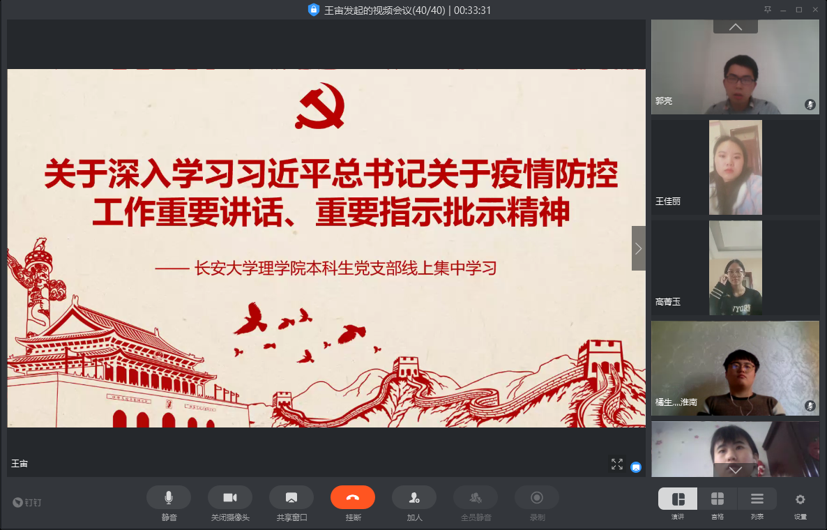新型冠状病毒感染的肺炎疫情防控进入了关键期,为深入贯彻党中央决策部署的要求,充分发挥党支部的战斗堡垒作用和广大党员的先锋模范作用,增强“四个意识”、坚定“四个自信”、做到“两个维护”,永利yl23411本科生党支部按照学校《关于深入学习习近平总书记关于疫情防控工作重要讲话、重要指示批示精神的通知》要求,组织全体党员于2月17日开展线上集体学习,此次会议由党支部书记王宙老师主持。