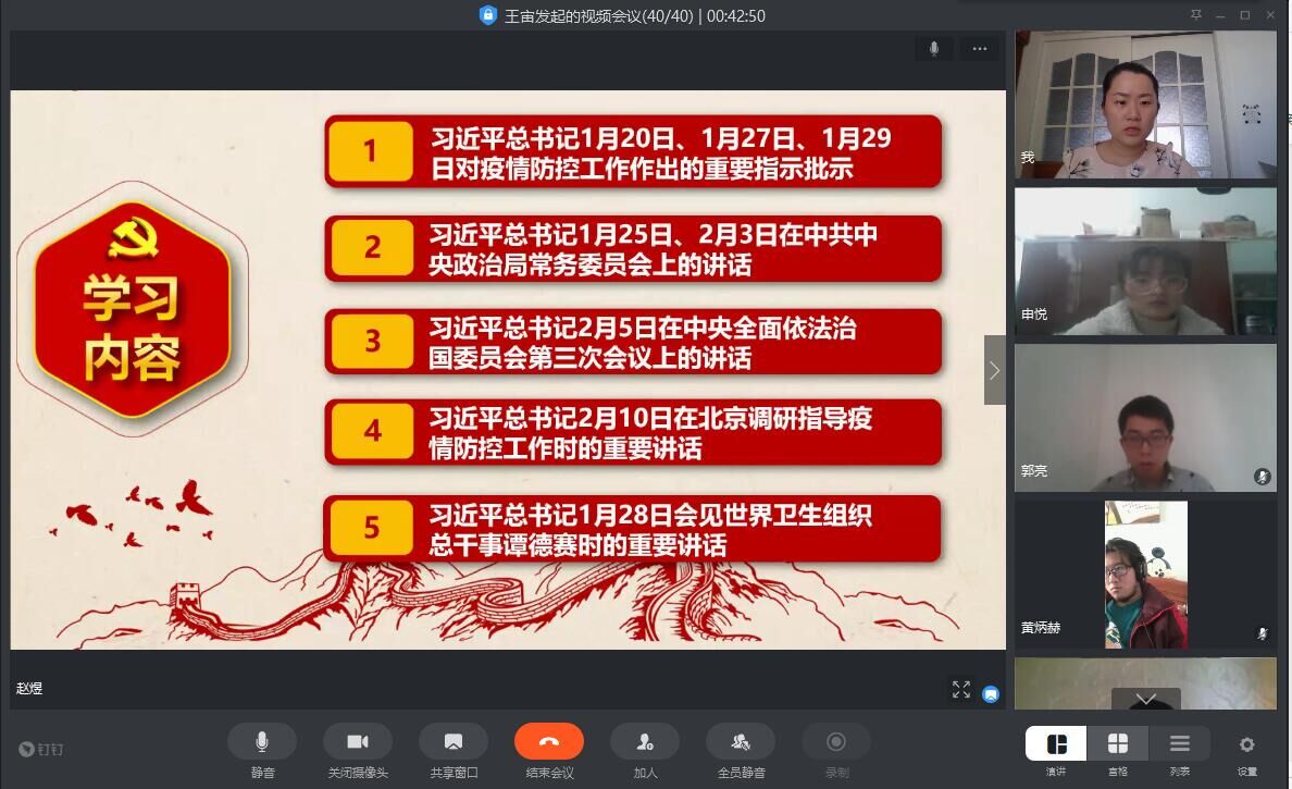 会议开始,党支部书记王宙老师宣读关于深入学习习近平总书记关于疫情防控工作重要讲话、重要指示批示精神的通知,强调此次集中学习的重要意义,就学习内容她提出此次线上学习要求,希望党员同志们在防疫阻击战的关键时期,时刻关注疫情趋势,提高政治站位,借助网络积极发声,切实把打赢疫情防控阻击战作为当前的重大政治任务。同时,鼓励大学生党员在保障自身安全的前提下,积极到所在社区或村报到,参加防疫工作,发挥党员应有的作用。