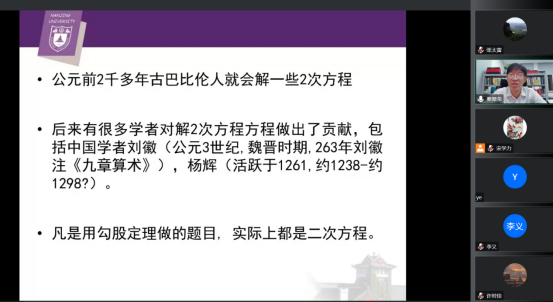 应学院邀请,2022年9月27日晚上,南京大学秦厚荣教授通过腾讯会议为我院师生作了题为“从解方程到伽罗华理论”的学术报告。报告会由我院院长宋学力教授主持,学科主任张太雷教授等100余师生参加了此次报告会。