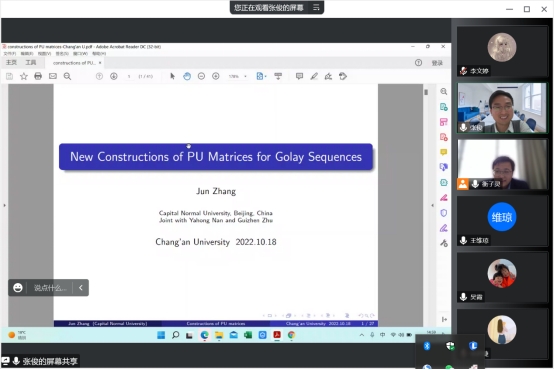 应永利yl23411邀请,10月18日下午15:00,首都师范大学张俊教授通过腾讯会议在线为我院师生作了题为“New Constructions of Paraunitary Matrices for Golay Sequences(Golay序列的PU矩阵的新构造)”的学术报告。数学与应用数学系衡子灵副教授主持报告,永利yl23411数学专业近二十名研究生参加了本次线上报告会。