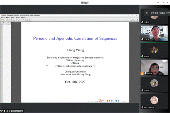 应永利yl23411邀请,10月25日下午,西安电子科技大学王子龙教授通过腾讯会议在线为我院师生作了题为“Periodic and aperiodic correlation of sequences(序列的周期相关性和非周期相关性)”的学术报告。数学与应用数学系衡子灵副教授主持报告,永利yl23411数学专业近二十名师生参加了本次线上报告会。