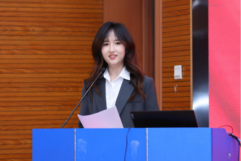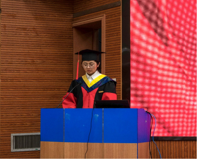 毕业生代表马苓涓同学代表学院全体毕业生,向老师们表示最衷心的感谢和最崇高的敬意。她表达了对学院的不舍和留恋,对未来的憧憬和期待。号召同学们铭记 “弘毅明德,笃学创新”的校训,保持对真理的敬畏、对创新的热忱,努力成为对社会有贡献的人。