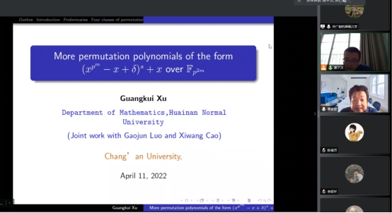 ”的学术报告。该报告在已有构造的基础上给出了一些新的置换多项式。为了给出这些置换多项式的判定定理,许广魁副教授和合作者研究了一系列特殊方程解的问题。此外,该报告就进一步的研究工作给出了建议。