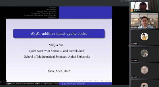 -additive quasi-cyclic codes”的学术报告。施敏加教授首先从已有的文献出发,提出文献中亟待解决的问题,从而引出本报告的研究课题。该报告详细介绍了施敏加教授和合作者最近在一类特殊环上定义的加性准循环码,并利用代数学知识给出了它们的代数结构和相关性质。此外,该报告就未来进一步的研究问题指明了方向。