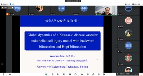 应数学学科主任张太雷教授邀请,2024年12月17日北京科技大学理学院马万彪教授通过在线方式为我院师生做“Global Dynamics of a Kawasaki Disease Vascular Endothelial Cell Injury Model with Backward Bifurcation and Hopf Bifurcation”的学术报告。报告会由数学学科主任张太雷教授主持,永利yl23411师生约30余人参加了报告会。