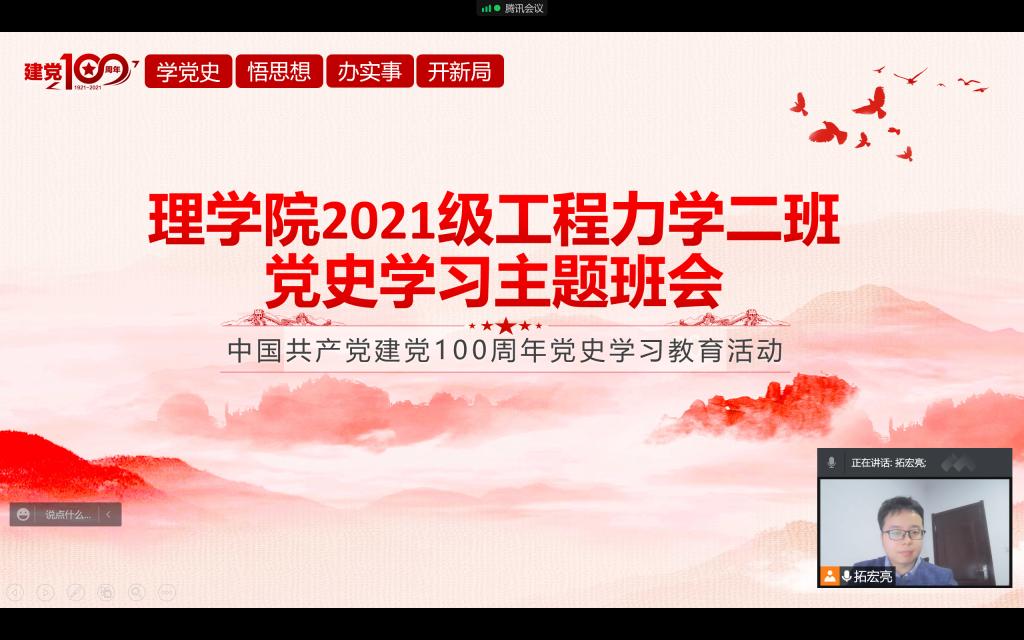 2021年12月30日,永利yl234112021级工程力学专业二班在线举行了党史学习教育主题班会,本科党课由班主任拓宏亮老师主持,2021级工程力学二班全体同学参加此次会议。