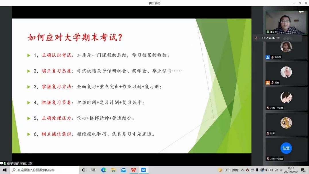 接着,衡老师针对期末复习工作对同学们进行了专题辅导。衡老师建议同学们正确认识考试、端正复习态度、掌握复习方法、把握复习节奏、正确处理压力、树立诚信意识,以饱满的精神状态做好期末复习工作。