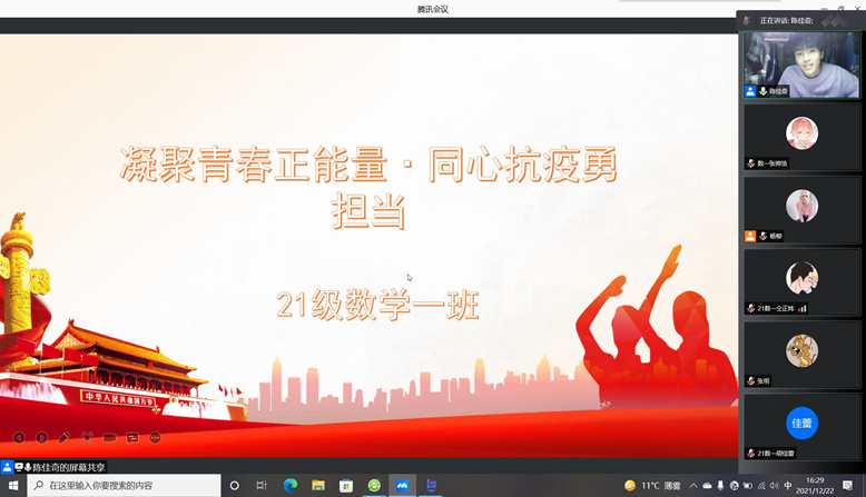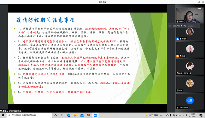 为了从严落实学校和学院关于疫情防控的各项政策,并做好期末复习工作,12月下旬,2021级数学一班通过腾讯会议召开了“疫情防控与期末复习动员”主题班会。数学一班班主任衡子灵老师和全体同学参加了本次班会。
