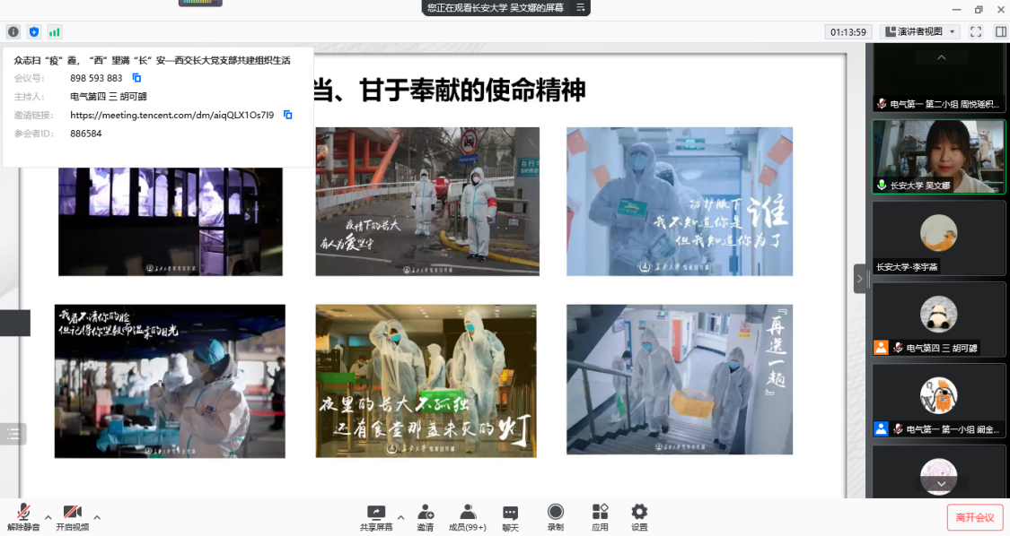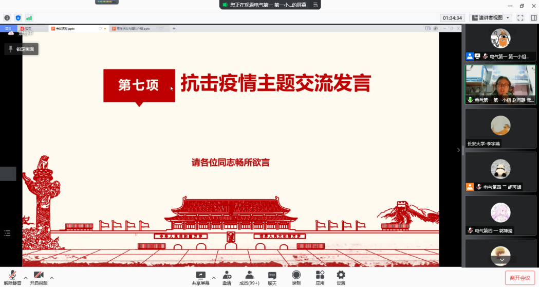 在致辞中,朱荣锋对与会党员表达了亲切问候,对抗击疫情中三个支部党员的表现给予肯定,号召党员进一步践行初心使命,让党旗在疫情防控一线高高飘扬。刘延海介绍了永利yl23411本科生党支部在抗击疫情中的主要工作,讲解了本次抗击疫情联学共建活动的意义,希望三个党支部互学互鉴,携手共进,在抗击疫情中充分发挥党员的先锋模范作用。随后,各支部分别介绍了本支部的情况。在活动中,西安交通大学电气学院南洋书院师生联合第四党支部胡可勰领学了习近平主席二〇二二年新年贺词,永利yl23411永利yl23411本科生党支部朱悦领学了习近平总书记在全国抗击新冠肺炎疫情表彰大会上的讲话。西迁精神宣讲团成员周悦瑶和长安星火宣讲团成员吴文娜分别宣讲了伟大抗疫精神。两校党员志愿者阚金鹏和王博分别分享了疫情期间志愿服务经历。三个支部成员围绕抗击疫情主题进行了交流发言。最后,西安交通大学南洋书院党总支学生副书记胡可勰进行了发言,表达了各党支部继续深化交流合作的意愿。