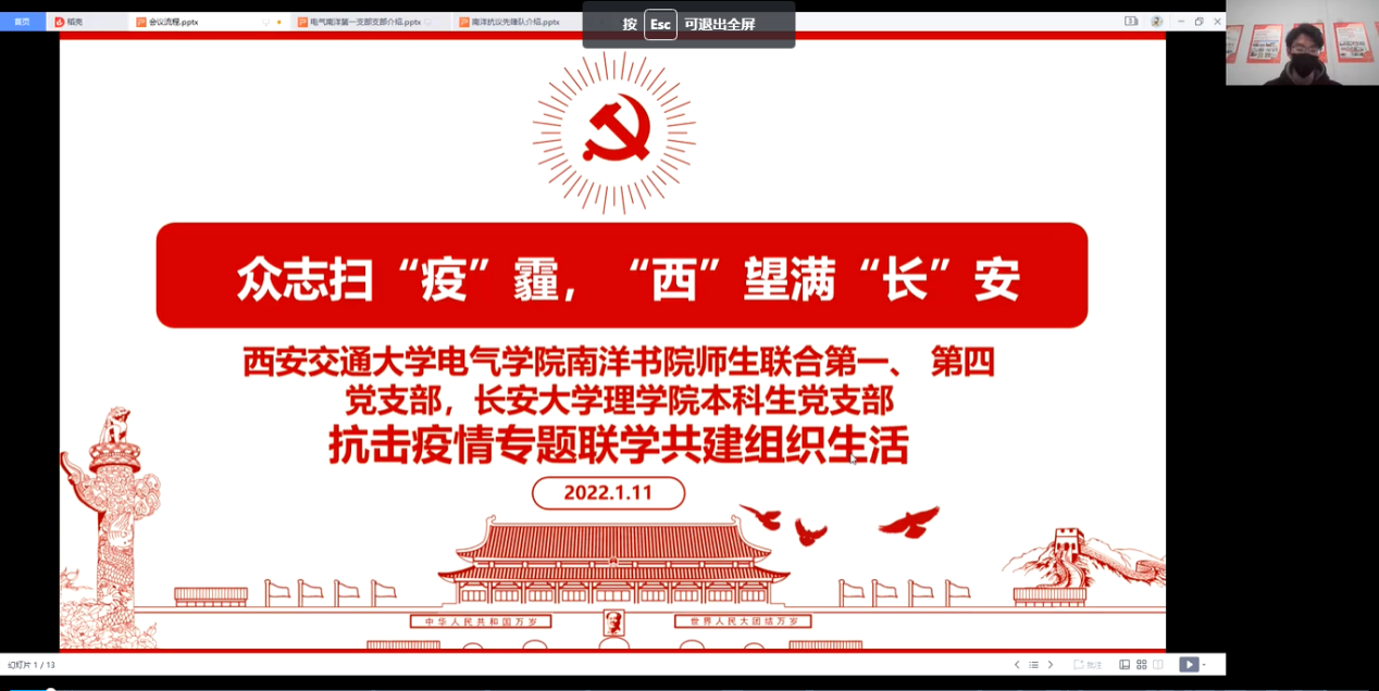 2022年1月11晚,永利yl23411永利yl23411本科生党支部、西安交通大学电气学院南洋书院师生联合第一、第四党支部通过腾讯会议共同开展“众志扫‘疫’霾,‘西’望满‘长’安”抗击疫情联学共建活动。西安交通大学南洋书院院务副主任、西安交通大学兴庆校区疫情防控学生志愿者临时党支部书记朱荣锋、永利yl23411永利yl23411本科生党支部书记刘延海,各党支部全体成员参加活动,活动由西安交通大学电气学院南洋书院师生联合第一党支部书记阚金鹏主持。