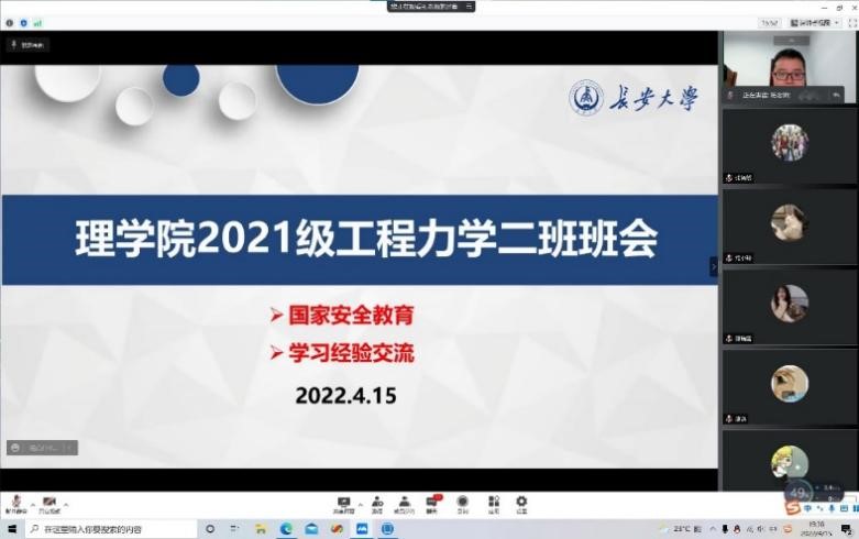 2022年4月15日晚,永利yl234112021级工程力学二班通过腾讯会议线上召开了国家安全教育和学习经验交流主题班会。班主任拓宏亮老师、2018级工程力学专业欧阳秋梦和王劲松同学及2021级工程力学二班全体同学参加了本次会议。