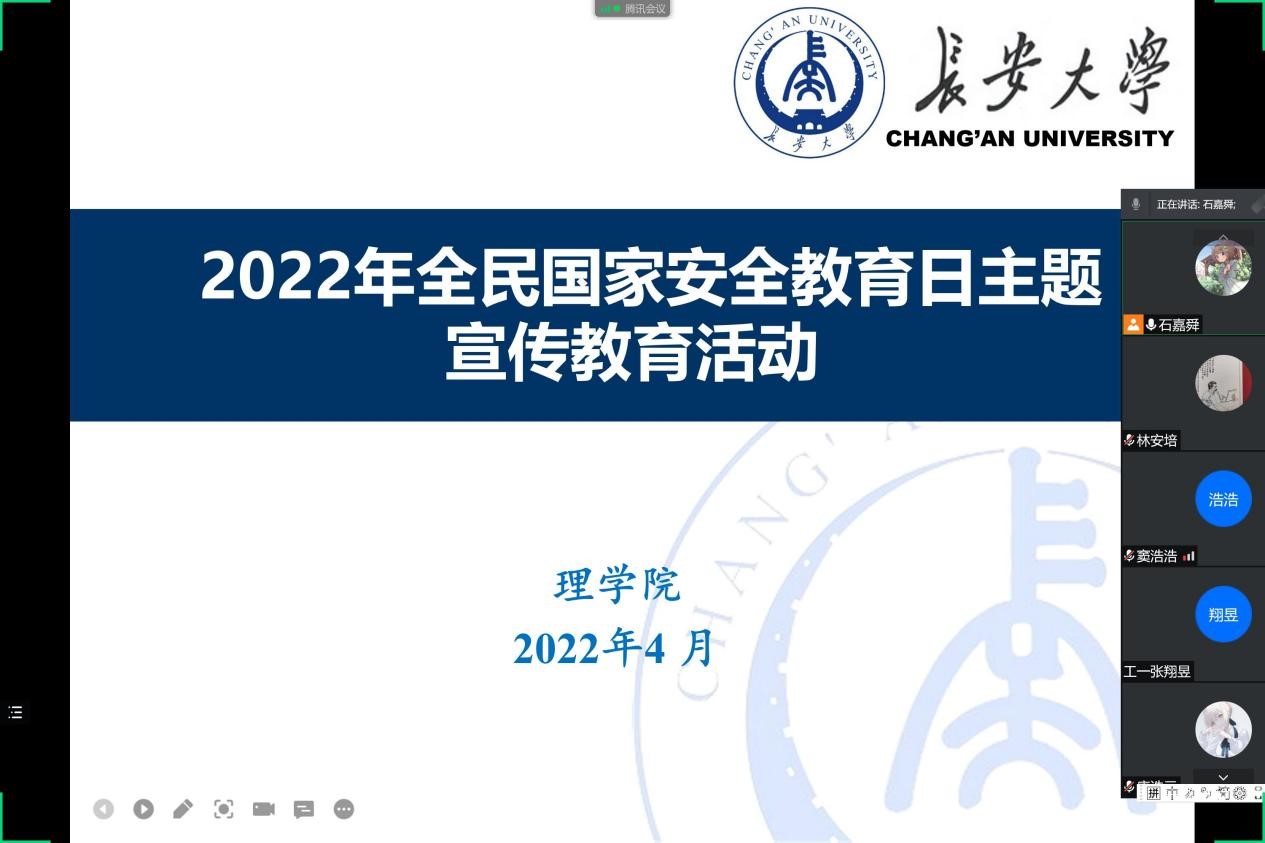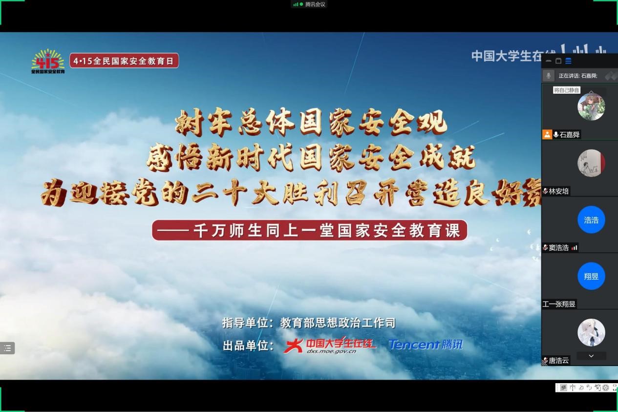 今年4月15日是第七个全民国家安全教育日,为进一步做好学生国家安全教育,引导学生树立总体国家安全观,以实际行动迎接党的二十大胜利召开,永利yl23411组织开展全民国家安全教育日主题宣传教育活动。本次活动以“树牢总体国家安全观,感悟新时代国家安全成就,为迎接党的二十大胜利召开营造良好氛围”为主题,通过组织开展主题教育线上会议、主题教育班会、组织学生收看安全教育网课等形式,引导学生进一步增强国家安全意识。
