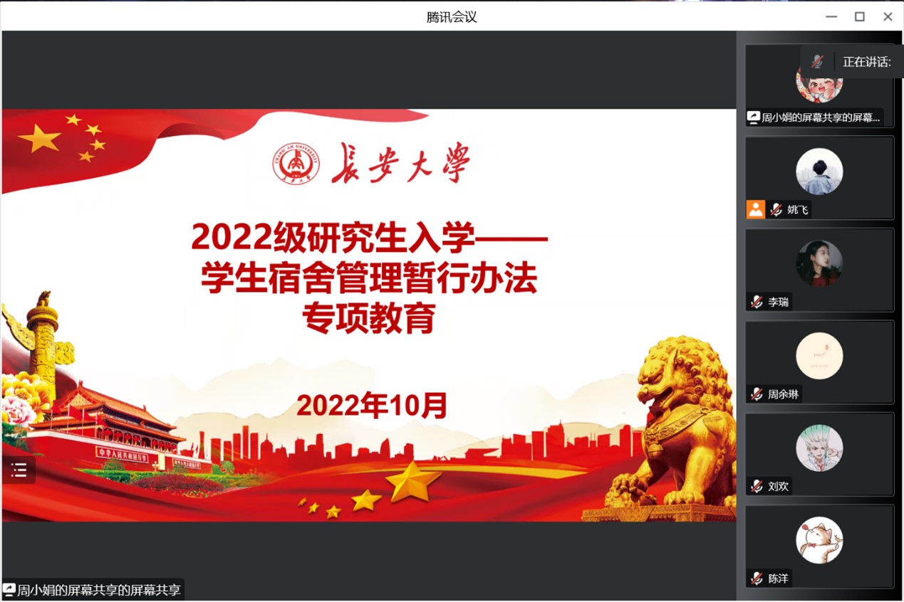 为了增强学生宿舍安全意识,促进新生适应宿舍学习生活和遵守学校社区相关管理制度,10月8日,永利yl23411通过腾讯会议召开2022级研究生新生教育工程之学生社区管理暂行办法专项教育,会议由研究生辅导员周小娟主持,全体2022级研究生新生参会。