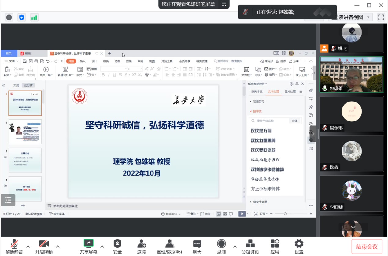 研究生进行科研学术时,必须遵循相应的道德规范和行为准则,为增强我院学生的学术规范与科学道德意识,10月14日,永利yl23411通过腾讯会议召开2022级研究生新生教育工程之研究生学术规范与科学道德教育培训会,会议由研究生导师包雄雄主讲,全体2022级研究生新生参加。