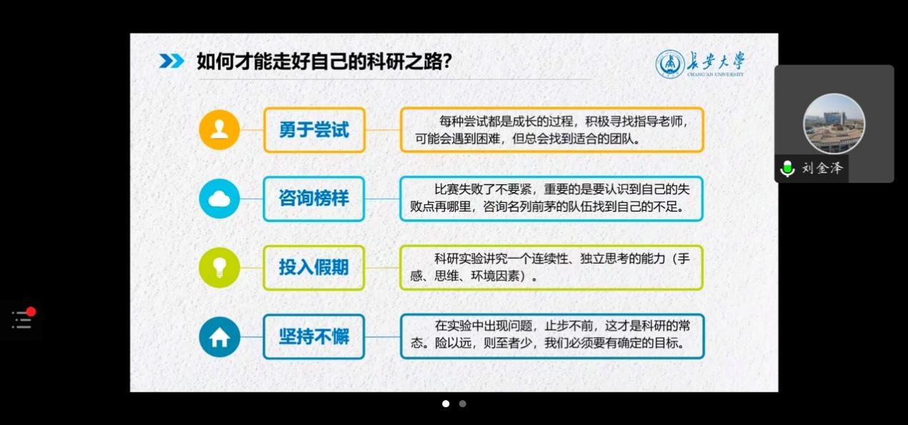 接下来,高年级获奖学生代表刘金泽展示了自己在大学期间的部分成果,结合自己的科创参赛经历和心得体会向同学们讲解如何开启科研之路,如何组建自己的科研小团队,鼓励同学们积极参加科创活动。