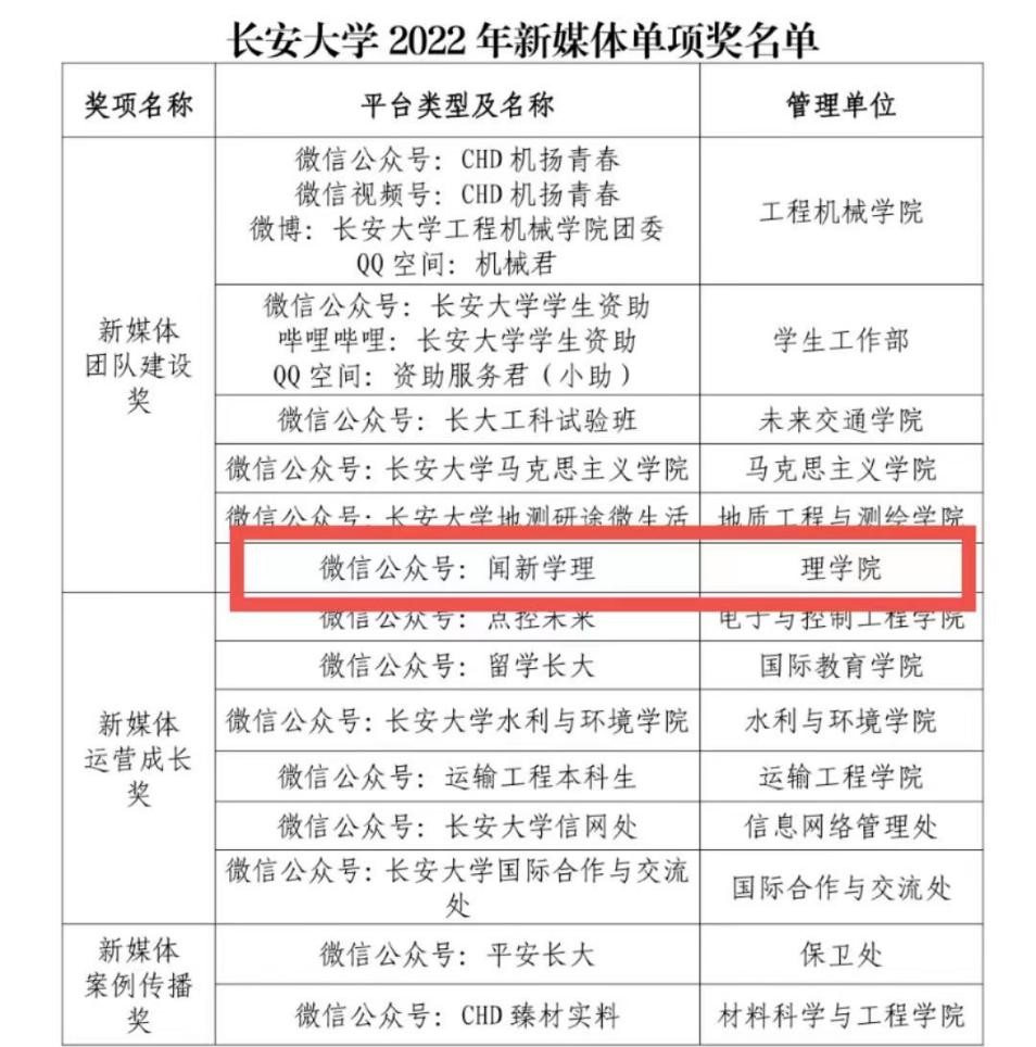 近日,学校党委办公室发布《关于表彰永利yl234112022年优秀校园新媒体平台及优秀新媒体指导老师的决定》(长大党宣〔2023〕9号),经过院系申报、专家评审等环节,永利yl23411“闻新学理”微信公众号荣获“新媒体团队建设奖”。