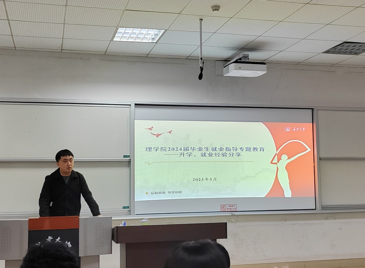 刘延海介绍了2024届毕业生就业指导专题教育的整体安排,讲解了举办本次经验分享会的意义。紧接着,四名同学结合自身经历,分别从保研、考研、求职等方面进行分享。朱悦介绍了保研的基本要求、学校选择、材料准备、夏令营申请等。薛嘉豪分享了自己的备考经历、复习计划、资料选择、考前练习等。胡森贵从考研与就业的选择、职业规划、寻找单位、网申流程、面试经验等方面进行了介绍。韦沆璐从求职与专业学习的关系,招聘信息选择,与HR的沟通等方面进行了分享。