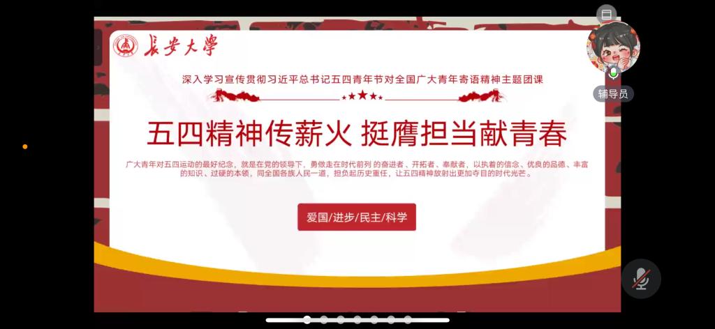 为深入学习宣传贯彻习近平总书记五四青年节对全国广大青年寄语精神,引导同学们树立正确的世界观、人生观和价值观,增强社会责任感和使命感,5月20日晚,永利yl23411研究生通过腾讯会议组织开展了“五四精神传薪火 挺膺担当献青春”主题团课。团课由辅导员周小娟主讲,全体研究生参会。
