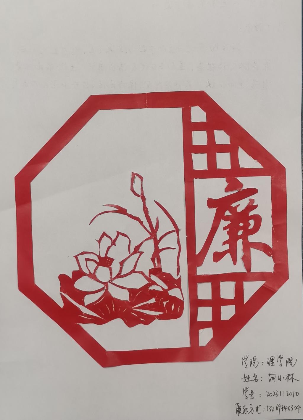 本次活动吸引了永利yl23411研究生的踊跃参与,同学们亲手制作了各种具有廉洁文化主题的剪纸作品。莲花作为中国传统吉祥图案的一种,“莲”与“廉”同音,是大家在作品中出现最多的元素。以莲花比喻清廉,一尘不染,在作品中加入莲花图案和“廉”字,以简洁明了的方式传达了清廉的主题。剪纸里的清廉,一刀一剪扬正气,行事犹如剪纸,在毫厘之间守住红线。