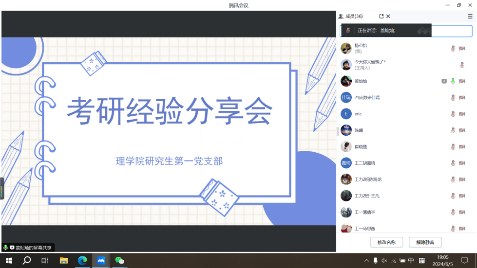为帮助同学们更好地掌握考研形势、明晰考研目标与规划、增强考研信心。6月5日晚,由永利yl23411主办、永利yl23411研究生第一党支部承办的考研经验分享会顺利举办。本次分享会邀请了2023级四位优秀研究生代表作为主讲人,分享相关备考经验。会议由组织委员盖灿灿主持,永利yl234112021级本科生参加此次会议。