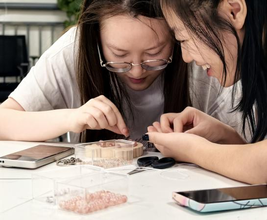随后,各位老师和同学开始串珠体验活动,现场学习了如何编织串珠等手工艺品,用串珠创作来表现自己内心深处的世界。同学们表示,参与此次活动感受到了手工艺的魅力,为大家提供了一个展示自己创意和才华的平台,解压的同时也更加热爱生活。