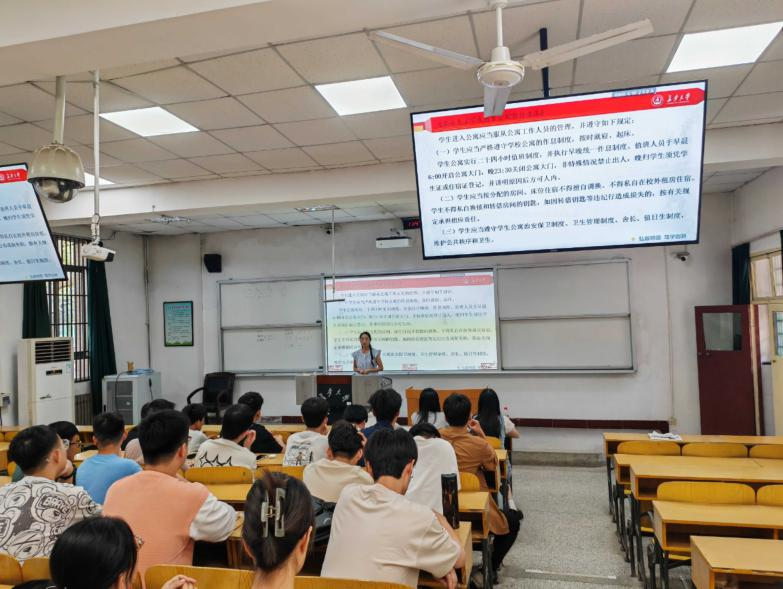 此次会议围绕校外住宿管理和学生宿舍管理两方面展开。在校外住宿方面,周小娟强调原则上不允许在读研究生校外住宿。如果要办理校外住宿,必须满足相应条件并申请校外住宿程序。随后周小娟仔细向新生说明了申请校外住宿的相关程序并进行校外住宿安全教育。在辅导员的认真讲解下,同学们都深刻了解了校外住宿的相关程序。随后,周小娟着重向新生讲解了学生宿舍管理的相关规定,明确指出新生应当遵守学生住宿管理规定、学生宿舍文明建设管理规定、学生宿舍安全管理制度等各项规章制度,并从消防安全、财产安全、网络安全及人身安全等方面对新生进行了宿舍安全教育,提示同学们要严格遵守请销假制度,重视宿舍安全,保障好自身权益。同时,周小娟强调了宿舍文明管理的必要性,要求同学们积极参与宿舍事务,共同维护整洁、温馨的宿舍环境。