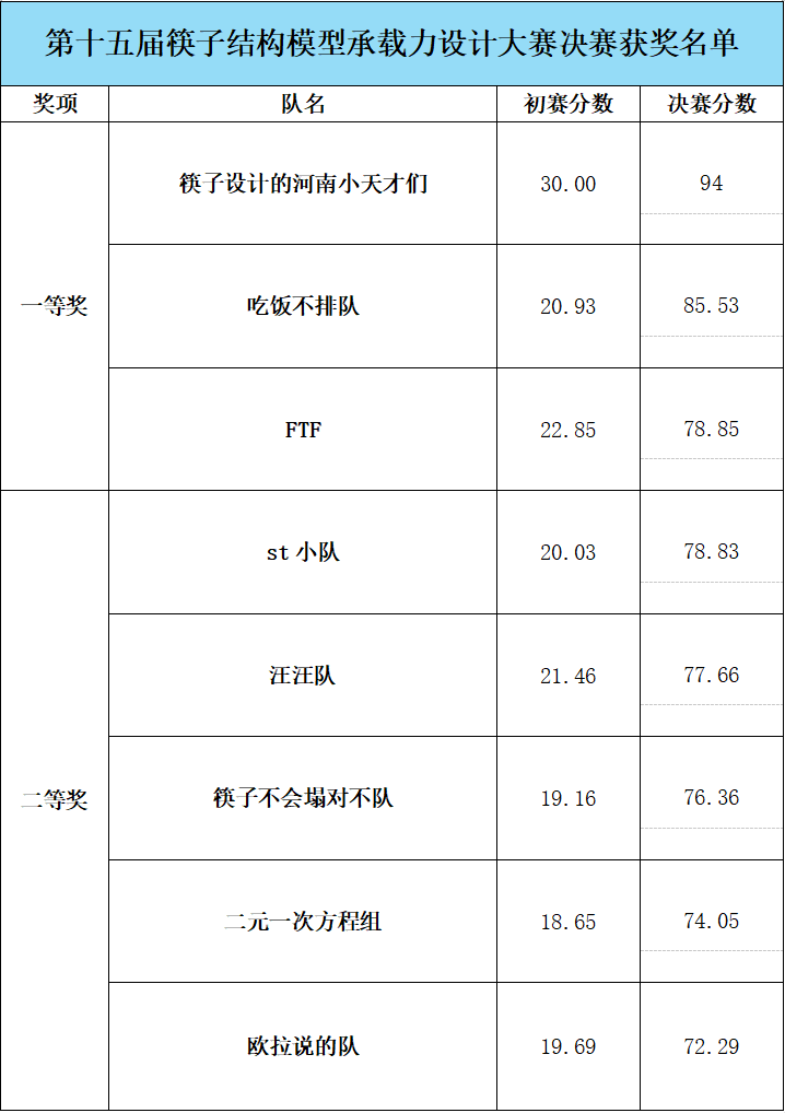 本次比赛初赛共有188支队伍参加,初赛模型承载力排名前八的队伍参与决赛答辩。答辩选手通过制作的实物展示、PPT讲解,阐述了模型结构的科学性、受力分析以及模型的创新型、实用性。评委们对于模型设计和制作过程进行了提问,帮助参赛选手改进作品。