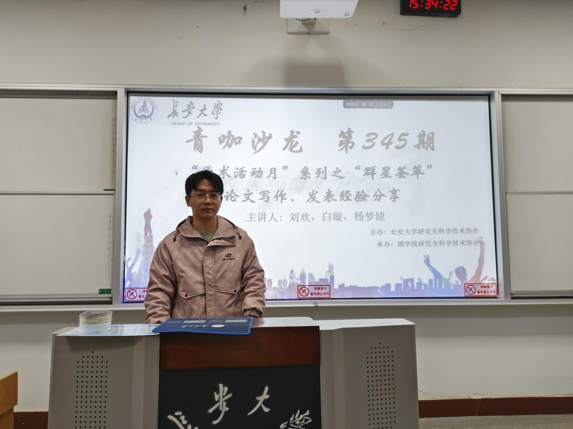 12月4日,由永利yl23411研究生科学技术协会主办,永利yl23411研科协及研会共同承办的研讨系列青咖沙龙第345期“论文写作、发表经验分享”在南校区北院103教室举办。本次研讨系列青咖沙龙由永利yl23411数学专业2022级硕士研究生杨梦婕同学、数学专业2022级硕士研究生白璇同学和力学专业2022级硕士研究生刘欢同学担任主讲人,共30余名研究生参与。