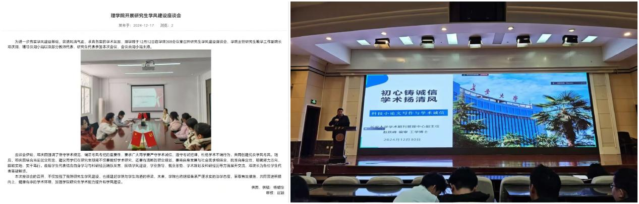 为加强研究生学术道德教育,营造风清气正的学术氛围,活动期间,学院组织开展了研究生学风建设座谈会、学术诚信与论文写作专题讲座。在12月12日学风建设座谈会上,副院长邓庆田围绕学风建设、学业指导、就业形势、学术规划及科研经历等方面与研究生代表展开交流。