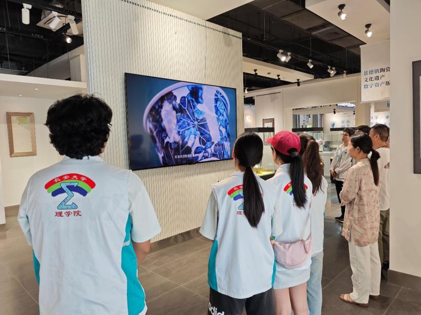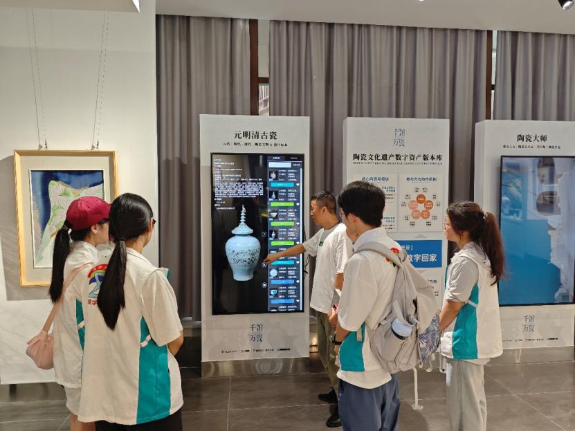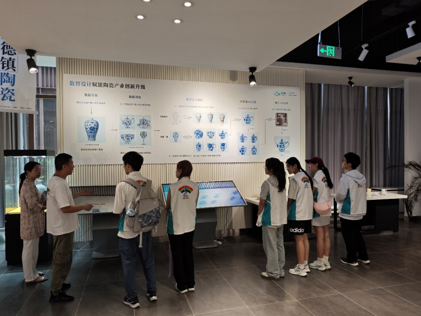 在陶阳里历史文化街区,实践队先后参观南麓遗址、明清窑作群,通过数字化展示装置了解遗址信息,与非遗传承人深入交流,了解制瓷技艺流程。在景德镇中国陶瓷博物馆,实践队通过AI智慧导览定位识别展品,了解陶瓷文物的历史价值和艺术成就,队员们通过3D扫描与触控系统的数字化展示装置,在屏幕上旋转、缩放文物的3D模型,观察陶瓷文物的细节特征和工艺特色。在景德镇陶瓷研究院,实践队与研究院副院长张良君等交流,全面了解景德镇陶瓷文化数智化发展情况,实地参观数智化展厅,了解到研究院和相关企业通过时域技术扫描陶瓷文物,将文物的细节以数据的形式存储下来,建立陶瓷文化遗产数字资产版本库,为陶瓷文物的修复、传承和保存提供技术支撑。