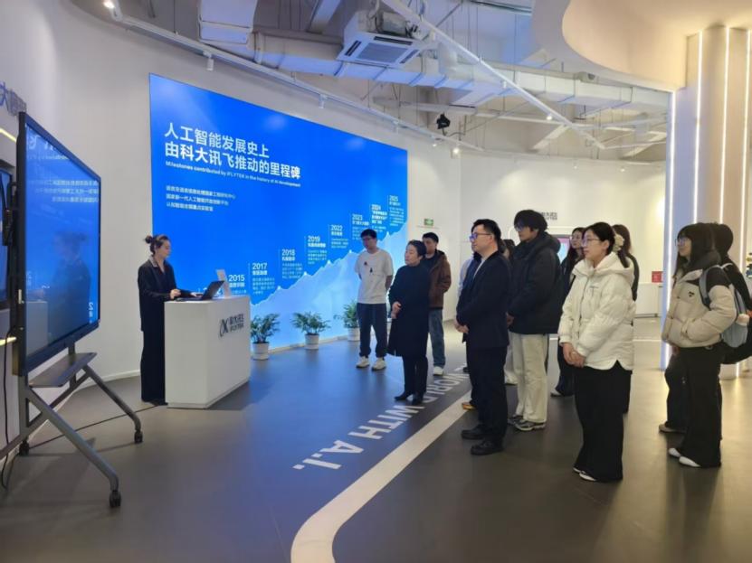 活动伊始,学院一行在工作人员引导下,走进科大讯飞AI展厅,沉浸式体验人工智能技术赋能千行百业的创新成果。从智能语音交互到自然语言处理,从智慧教育场景到智能办公解决方案,直观感受了科大讯飞在核心技术领域的突破与产业应用的落地成效,深刻认识到人工智能产业对复合型、创新型人才的迫切需求。