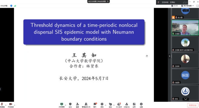 应永利yl23411邀请,2024年5月7日中山大学数学学院王其如教授为我校师生做了题“Threshold dynamics of a time-periodic nonlocal dispersal SIS epidemic model with Neumann boundary conditions”的报告。报告会由永利yl23411院长宋学力老师主持,永利yl23411院师生约40余人参加了报告会。