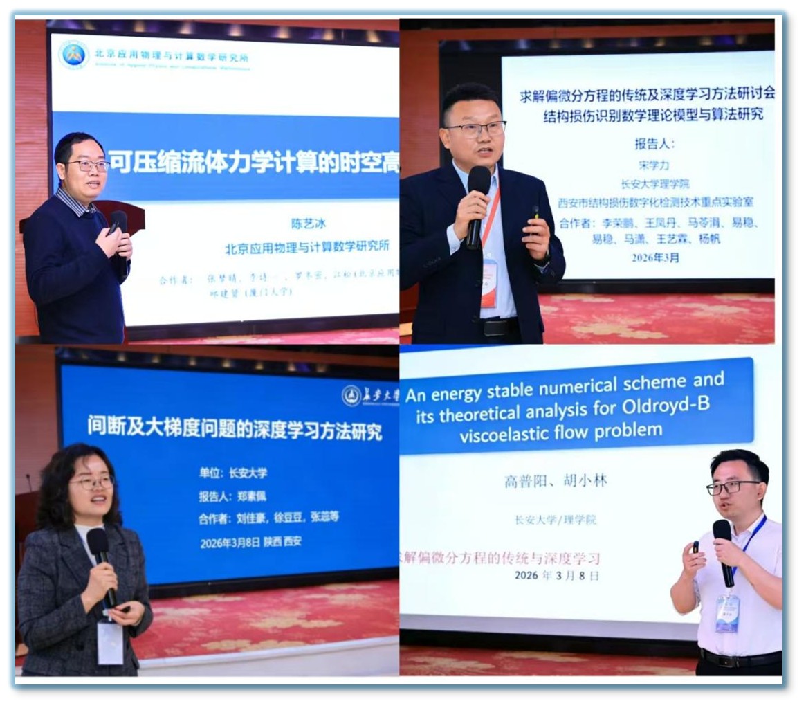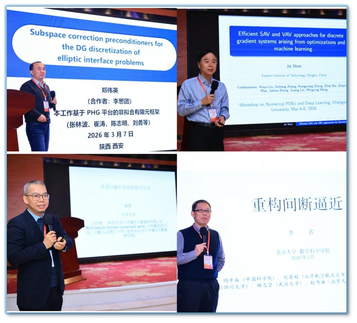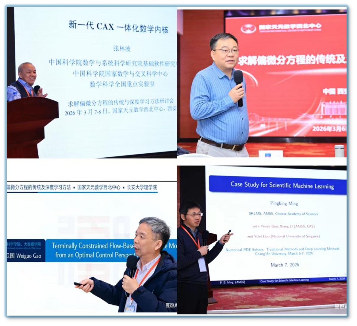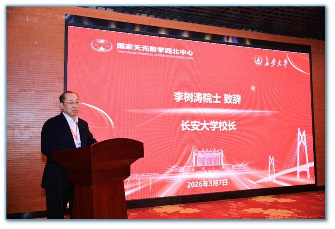 徐宗本院士代表国家天元数学西北中心致辞。首先,他详细介绍了中心的定位、目标和任务;其次,他指出求解偏微分方程的传统及深度学习方法是中心2026年度重点资助的学术活动主题之一,希望与会者多关注人工智能和计算数学的深度融合,为科学计算寻求更加科学而高效的理论与方法;最后,他表示中心将继续支持西北地区数学工作者开展学术活动。