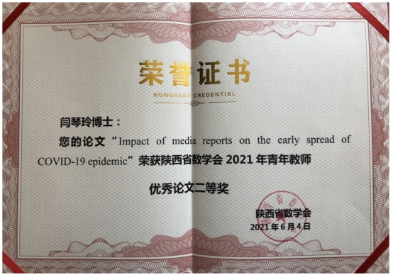 2021年陕西省数学会青年教师优秀论文二等奖