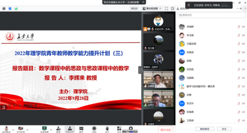 应永利yl23411邀请,2022年9月28日下午,吉林大学李辉来教授通过腾讯会议为我院教师做了题为“数学课程中的思政与思政课程中的数学”报告。报告会由永利yl23411院长宋学力教授主持,永利yl23411约90余名教师参加了此次报告会。