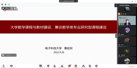应永利yl23411邀请,2022年9月28日电子科技大学黄廷祝教授通过腾讯会议为我院师生作了题为“大学数学课程与教材建设,兼谈数学专业研究型课程建设”的学术报告。报告会由我院副院长商泽进主持、院长宋学力教授致辞,数学学科主任张太雷等近百位师生参加了本次报告会。