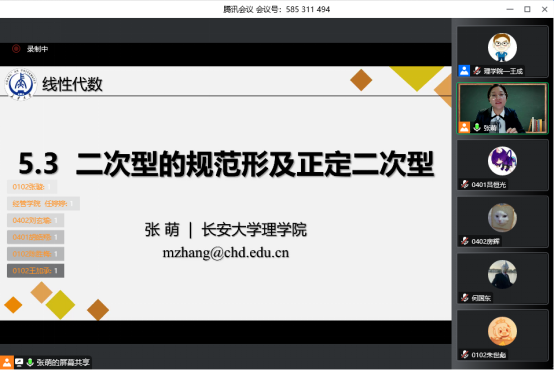 教学公开(观摩)课由青年教师张萌副教授主讲,题目为“《线性代数》课程——二次型的规范形及正定二次型”。在一个半小时的课程中,张萌先通过四个问题引导学生深入认识和剖析了二次型的规范形的定义、内涵和注意事项,并运用永利yl23411在线学堂平台与学生互动,通过随堂测试、提问等方式了解和掌握学生实时的学习状态;随后通过“举例说明、发现问题、分析问题、解决问题”的教学设计引导学生掌握正定二次型的定义、一步步分析和探索出常见结论和判定定理,最后再利用一题多解帮助学生巩固所学。