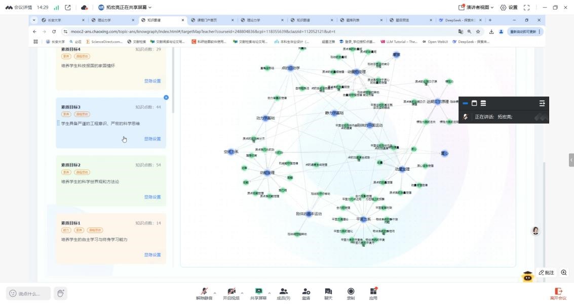 理论力学课程组首先详细汇报了理论力学智慧课程建设的进展情况。课程组通过对理论力学知识点的精细梳理和思政元素的深度挖掘,成功构建了一套“知识图谱+问题图谱+目标图谱+思政图谱+AI辅助”的智慧课程教学体系,并基于AI大模型开发了理论力学辅助教学的系列动画,开发了助学助教的智能体,初步形成了“基础扎实、思政融通、智能辅助、工程导向”的智慧课程。