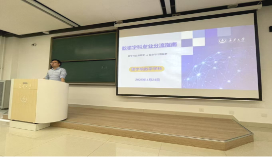 为帮助数学类专业学生做好专业选择与学业规划,做好数学类专业分流工作,4月24日晚7时,学院数学类专业分流指导交流会在北校区鸿远 WH1304 教室举行。数学学科负责专业建设工作的系主任高普阳做指导报告,系副主任石垚以及 2023 级全体本科生参加,会议由学院教学秘书王成主持。