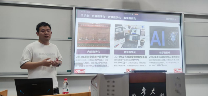 2025 年 5 月 7 日下午,学院与教育研究与评估中心联合学堂在线慕课平台在南校区北院 B103 教室举办题为 “AI 教学平台应用及智慧课程建设” 的工作坊培训活动,旨在探索人工智能赋能教育教学的解决方案,推动智慧课程建设迈向新台阶。工作坊活动共有来自全校15个学院的80余位教师参与,学院副院长徐春龙主持活动。