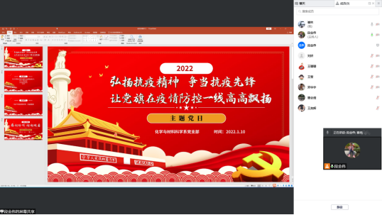 为深入学习领会习近平总书记关于疫情防控工作的重要讲话精神,充分发挥党支部在疫情防控中的战斗堡垒和党员先锋模范作用,坚定抗疫必胜信心,化学与材料科学系党支部于1月10日开展线上“弘扬抗疫精神 争当抗疫先锋 让党旗在疫情防控一线高高飘扬”主题党日学习,段金伟主持会议,支部全体党员参加学习。