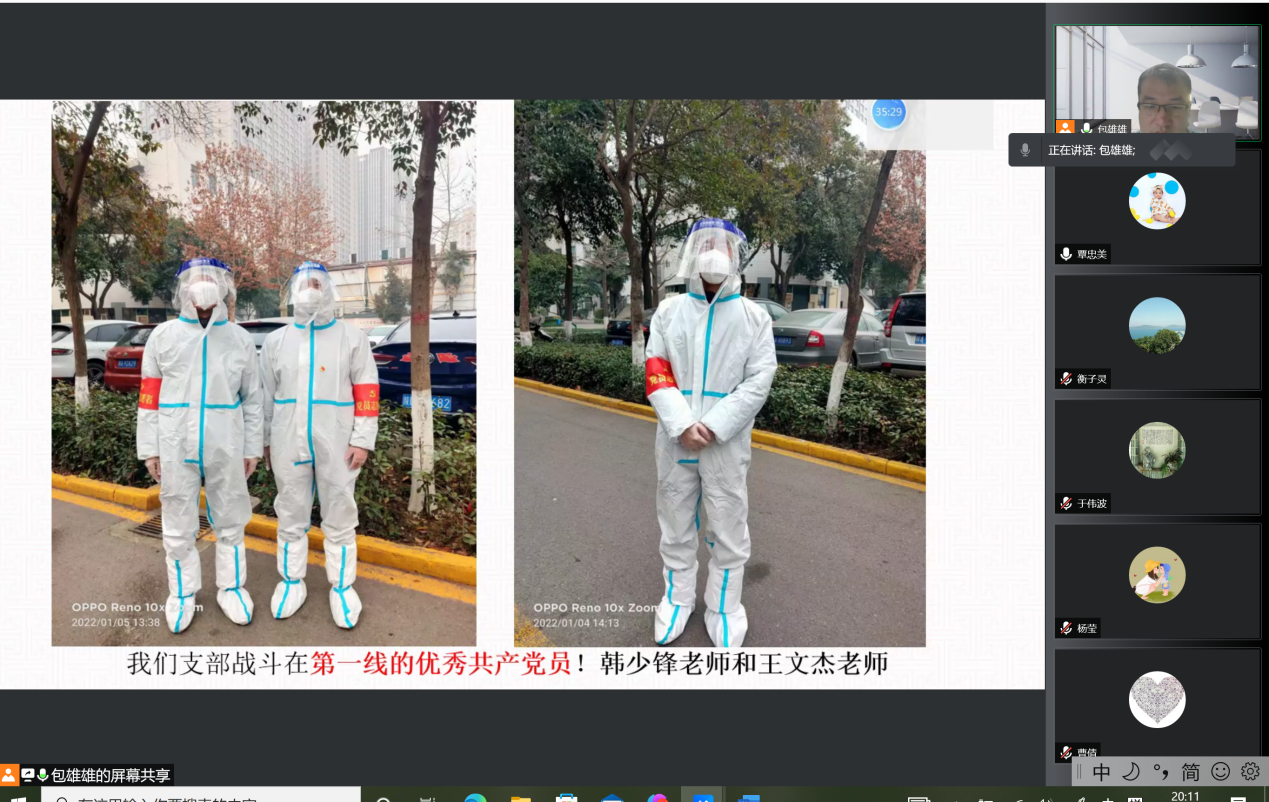 最后支部书记包雄雄进行会议总结,介绍了我们支部战斗在第一线的优秀共产党员韩少锋老师和王文杰老师,呼吁全体党员发挥先锋模范作用,在保证自身安全的前提下积极参与志愿服务,助力抗疫成功。