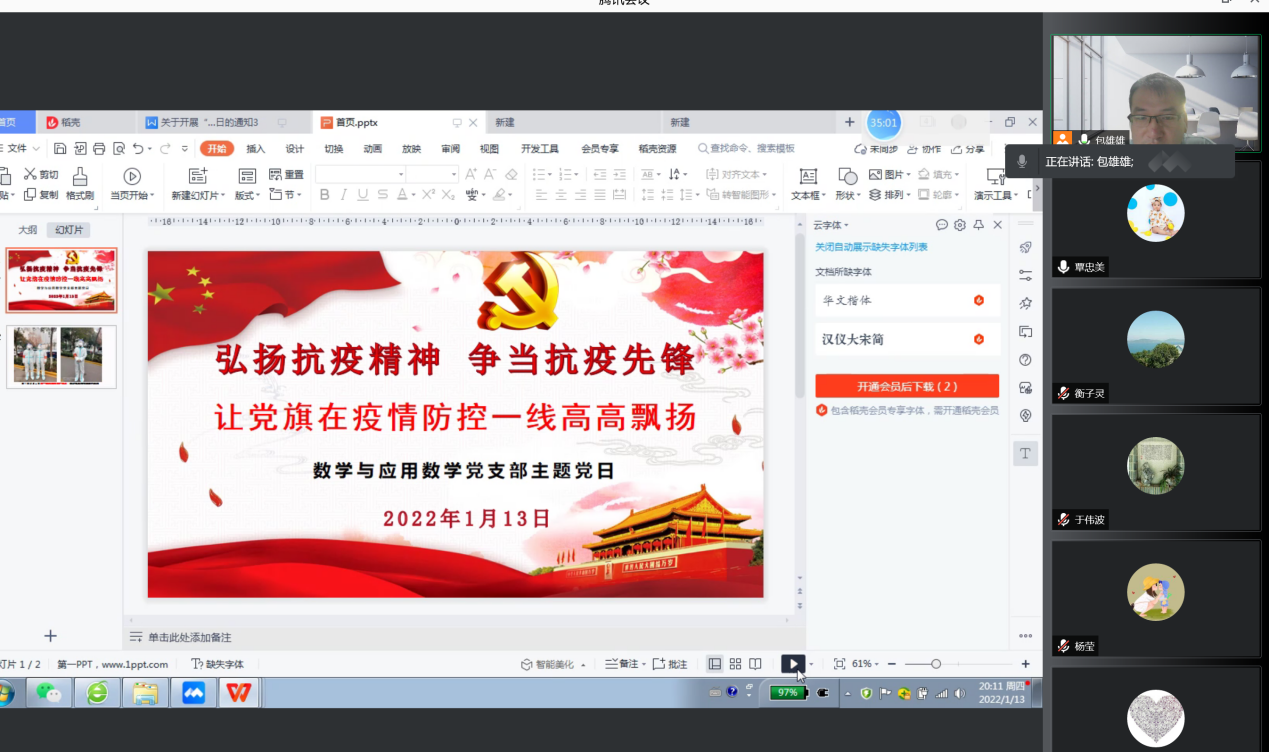 1月13日晚上7点,数学与应用数学系党支部召开了“弘扬抗疫精神 争当抗疫先锋 让党旗在疫情防控一线高高飘扬”主题党日活动。活动由支部书记包雄雄主持,全体党员参加。