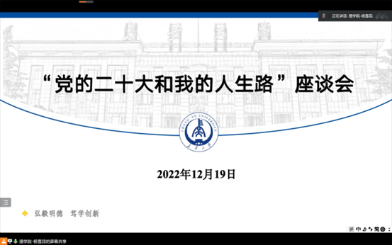 会上,姜洪分享了学习党的二十大精神的感悟,结合自身成长和工作经历,分享了身边党员的感人事迹和脱贫攻坚的主要成就,讲述了改革开放以来,尤其是新时代十年的伟大变革,号召青年学生坚定不移听党话跟党走。王虎回忆了自己从求学到工作以来,我国发生的巨大变化,分享了自己在求学和工作中不懈奋斗的故事,鼓励青年学生做好规划,树立目标,砥砺奋进,不负时代。刘建民向青年学生讲述了老一辈教育工作者笃学创新、奋斗报国的故事,激励青年学生弘扬优良传统,赓续红色基因。