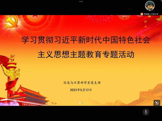 根据学校和学院相关工作安排,信息与计算科学系党支部于5月12日晚上组织开展了 “学习贯彻习近平新时代中国特色社会主义思想主题教育”专题活动,会议由支部书记程晓晗主持。