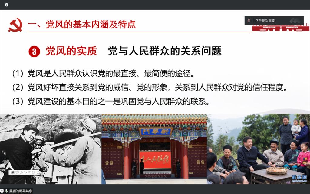 屈颖从中国共产党作风的基本内涵及特点、开展党风建设的重要性、党风建设的主要内容、中国共产党的“三大作风”和落实中央八项规定五个方面讲授本次党课。她强调,党的作风建设是中国共产党保持先进性的必要条件,要求全体党员认真学习贯彻习近平新时代中国特色社会主义思想和党的二十大精神,结合自身实际,找准差距、补齐短板、提升素质、增强本领,发挥先锋模范作用,在学习生活、社会服务等方面做出更多更好的成绩,为学院发展作出更大贡献。