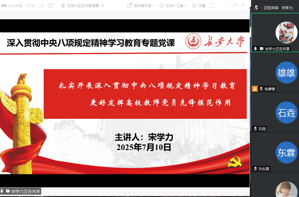 为推动深入贯彻中央八项规定精神学习教育有效开展,促进党建与业务工作深度融合,2025年7月10日,理学院院长宋学力教授以《扎实开展深入贯彻中央八项规定精神学习教育 更好发挥高校教师党员先锋模范作用》为题为数学与应用数学系党支部和信息与计算科学系党支部讲授专题党课。党课由数学与应用数学系党支部书记包雄雄主持,数学与应用数学系党支部和信息与计算科学系党支部全体党员参加会议。